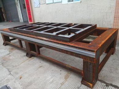 采用方鋼焊接,回火處理,消除焊接應(yīng)力,保證使用多年后不會(huì)變形。床身加強(qiáng)筋比較密集,增加了床身強(qiáng)度,保證底板不變形。
