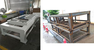 床身   采用方鋼焊接,回火處理,消除焊接應(yīng)力,保證使用多年后不會(huì)變形。床身加強(qiáng)筋比較密集,增加了床身強(qiáng)度,保證底板不變形。