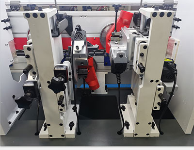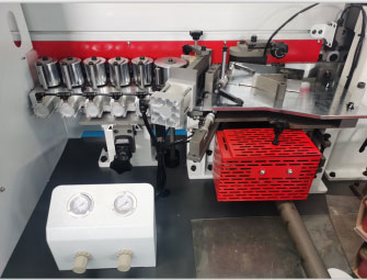 6輪壓貼貼合比4輪更精密,膠線輕微不跑帶,貼合牢靠,厚薄木皮均可輕松走帶,氣缸控制開關(guān)膠門,膠量穩(wěn)定,厚薄均勻。